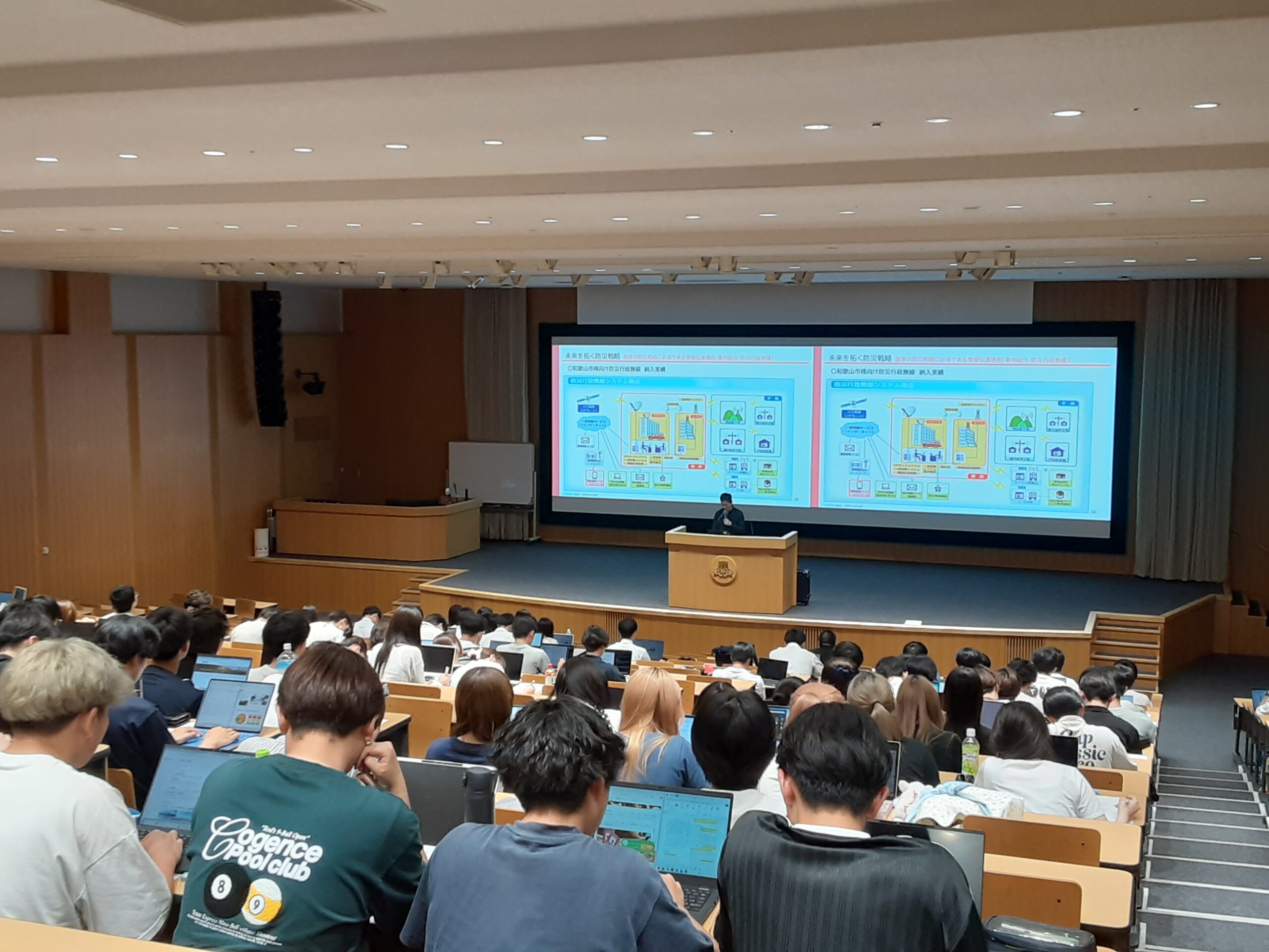 今回の講座では、当学部の主要カリキュラムとなる防災・減災分野への理解を深めていただくことや、次世代を担う人材の育成に繋げることを目的に、当社の防災・減災に役立つ製品やシステムの紹介をはじめ、当社が開発から提供、保守までを手掛けている「防災行政無線システム」の歴史や運用方法などについて説明しました。