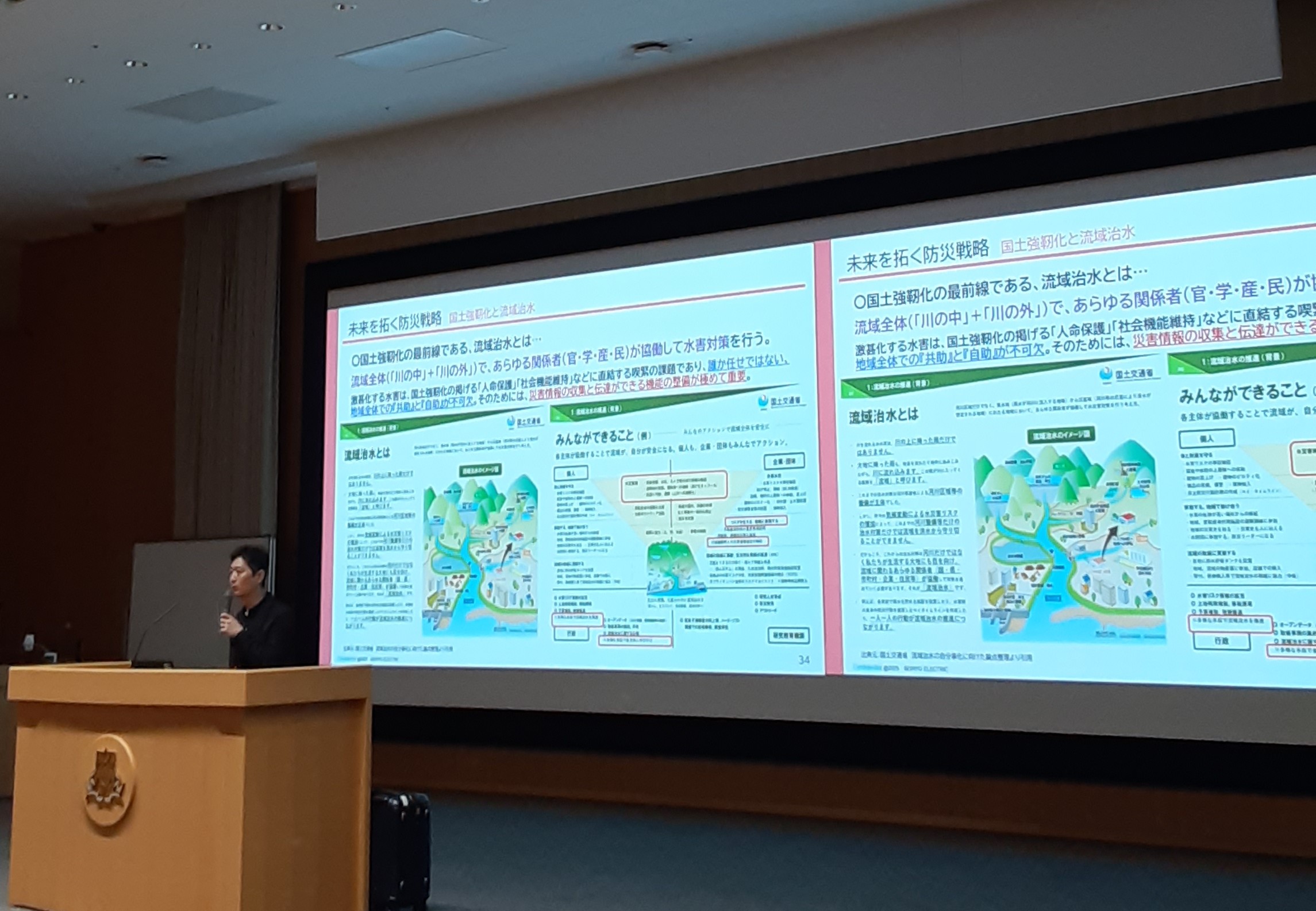 今回の講座では、当学部の主要カリキュラムとなる防災・減災分野への理解を深めていただくことや、次世代を担う人材の育成に繋げることを目的に、企業の社会的責任や国が掲げる防災戦略(国土強靭化や流域治水対策等)について説明したほか、当社の防災・減災分野をはじめとしたCSRに関する取り組みなどについてもご紹介しました。