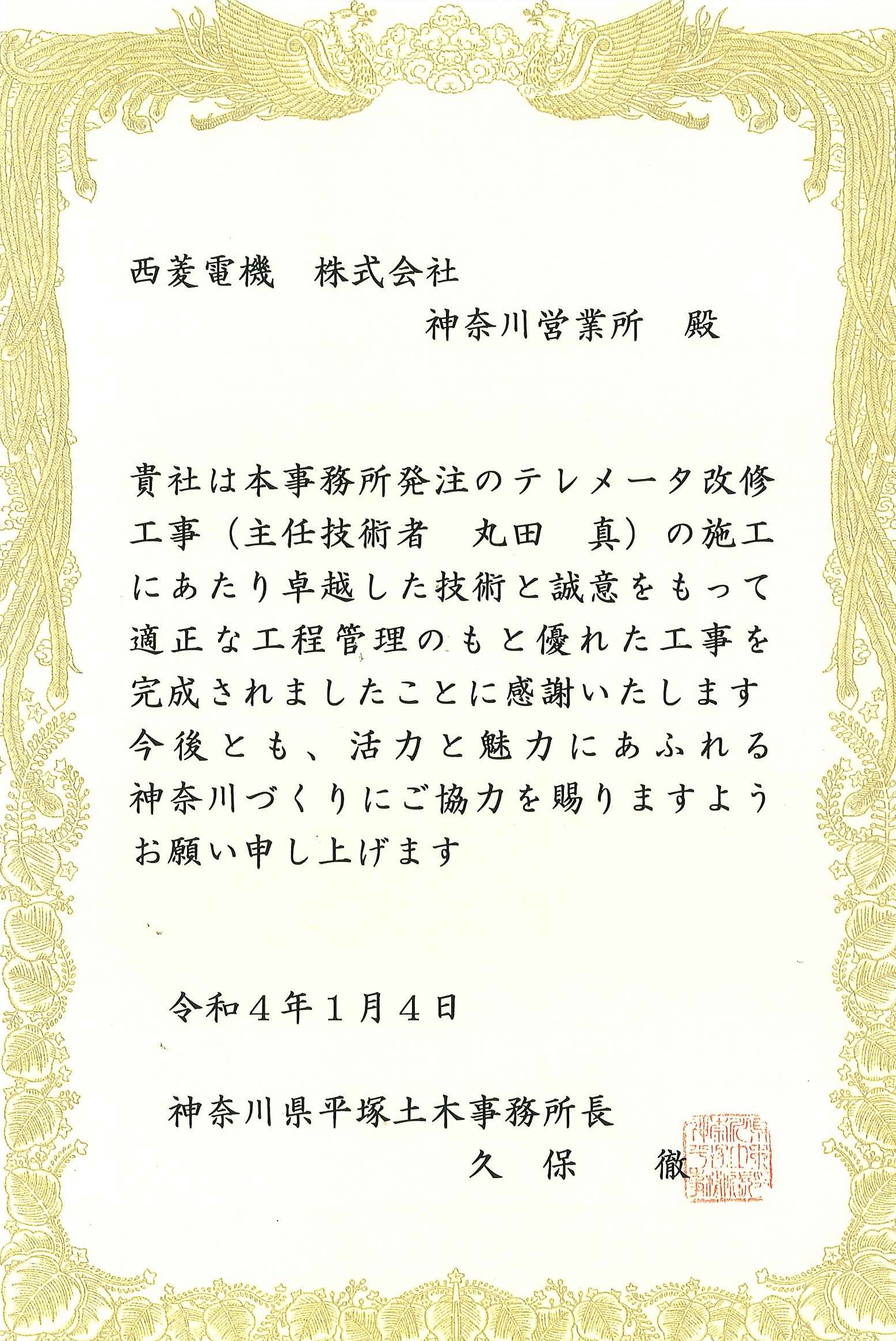 卓越した技術と適正な工程管理のもと優れた施工を完了したことが評価され、神奈川県平塚土木事務所長様より感謝状をいただきました。