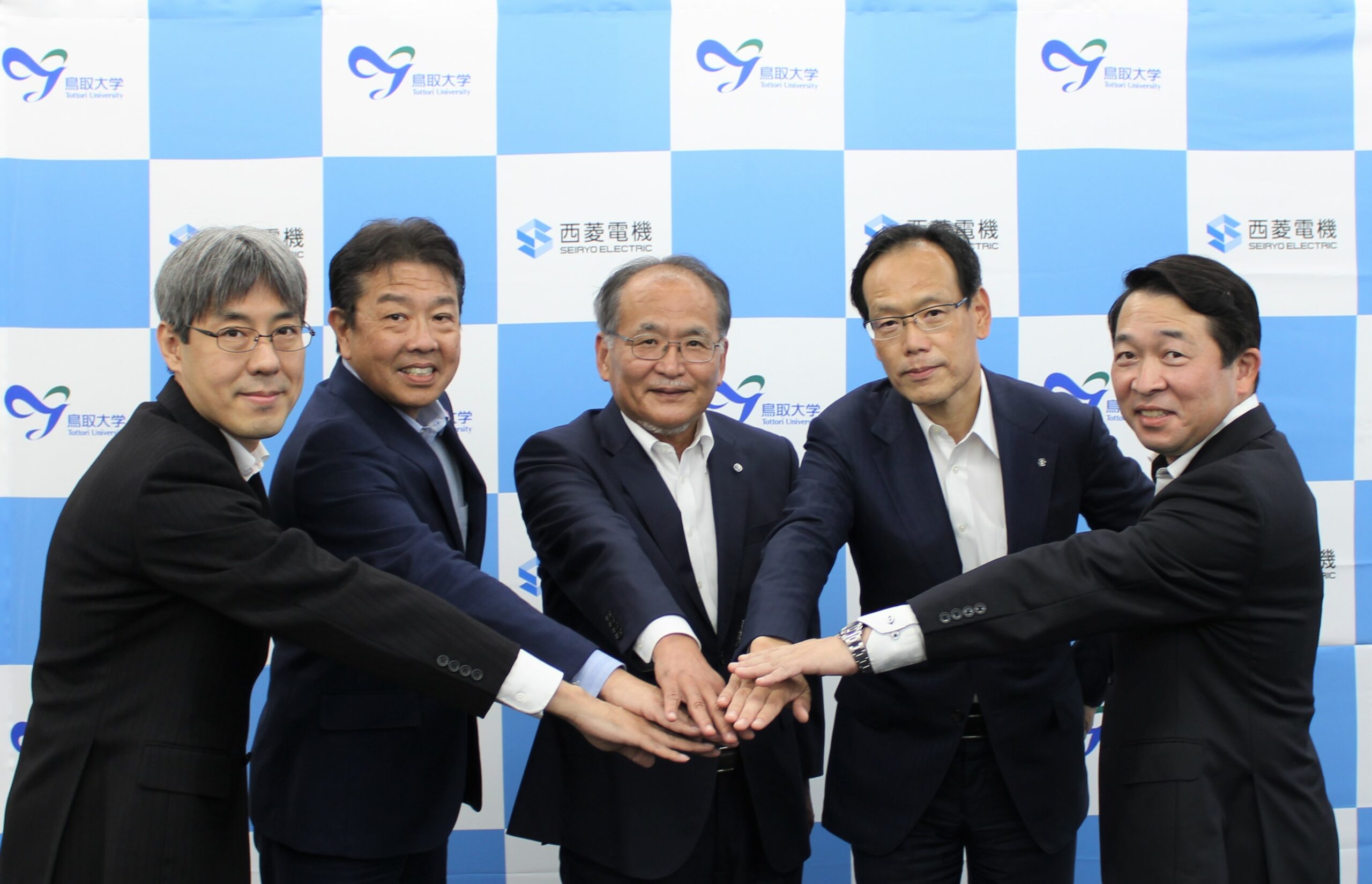 工学部長 坂口裕樹様、学長 中島廣光様、西菱電機 社長 西井希伊、鳥取西菱電機 社長 鳥居紀彦
