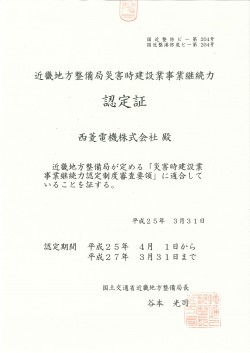 当社は平成25年4月1日、近畿地方整備局より事業継続計画(BCP)の認定を受けました。