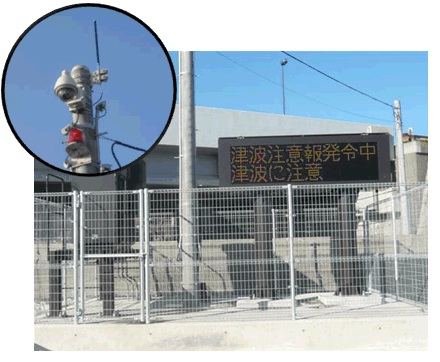 津波や高潮などの気象情報を発令された際、見やすさに優れる巨大表示板にその内容を表示し、迅速な避難活動を支援します。