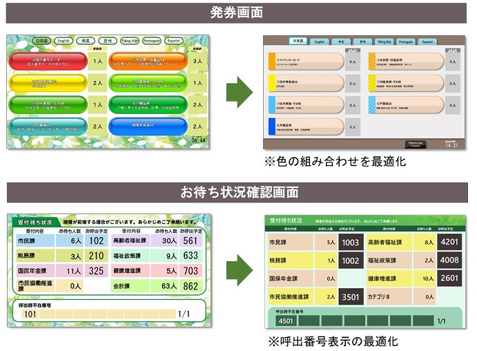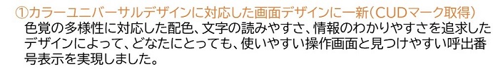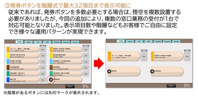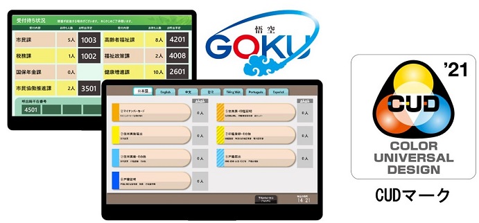 今回のリニューアルでは、カラーユニバーサルデザイン(CUD)に対応する画面デザインに一新〔CUDマーク取得(※)〕したほか、多言語での音声呼出し機能の追加など、どなたでも安心・快適にご利用いただける製品へと進化させました。また、お客様の来庁・来店をご申告いただくチェックイン機能の追加に加え、発券選択ボタンを階層式に最大32項目まで増設。悟空1台で複数の業務受付を可能にするなど、職員やスタッフの業務効率化、コスト削減に資する新機能を多数追加しました。 今後、全国自治体への拡販を進めていくとともに、多様な利用者の利便性・操作性の向上、自治体をはじめとする職員・スタッフの効率化を実現する機能強化に引き続き努めてまいります。