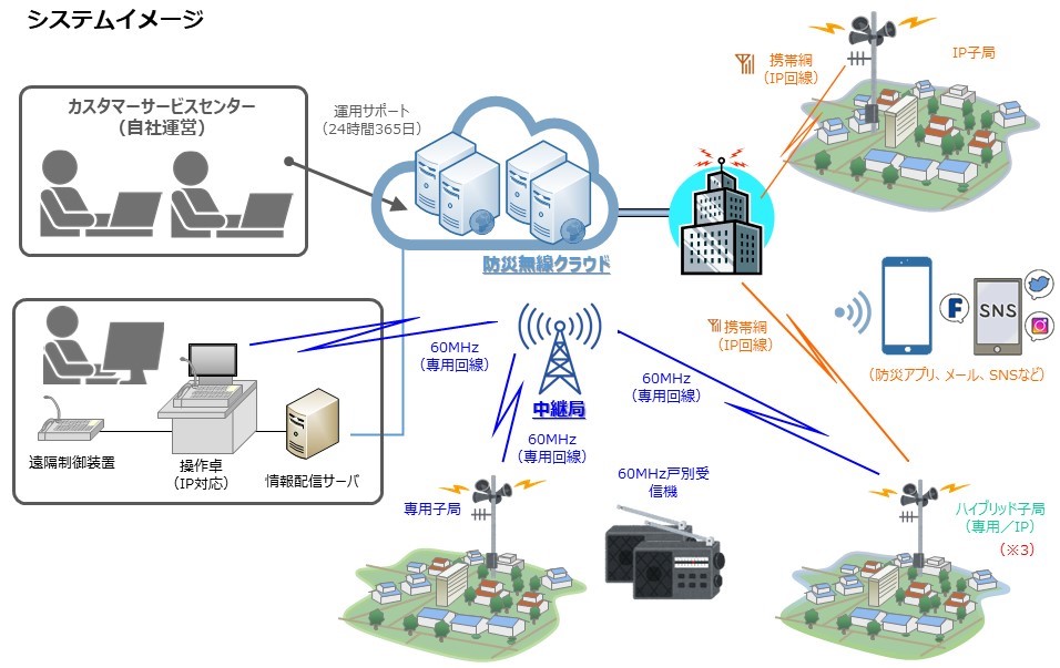 従来の防災行政無線システムは市役所等の庁舎から中継局を経由し、拡声子局や戸別受信機に60MHz帯の専用無線回線で通信を行い防災情報等の配信を行っていました。「ハイブリッド同報無線システム」は、これに携帯電話回線で通信可能な拡声子局(IP子局)を組み合わせることで通信路の多ルート化を実現。さらに両方の回線で通信可能な拡声子局(ハイブリッド子局)を組み合わせることで通信路の2重化を実現するシステムです。(※2)(※3) 操作卓や拡声子局などの基本設備は共通化しており、回線ごとにシステムを整備する必要がなく、お客様のニーズにあわせた柔軟なシステム構築が可能です。