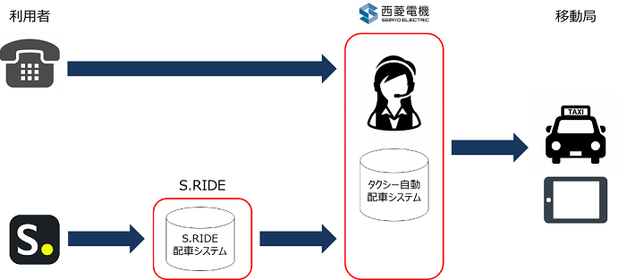 今回、西菱電機のタクシー自動配車システムを導入しているタクシー事業者と乗務員の更なる利便性向上のため、西菱電機のタクシー自動配車システム「AMCOSS」とS.RIDEの配車システムを連携させることで、乗務員が使用する既存の乗務員専用タブレットに対し、電話依頼に加えて、タクシーアプリ「S.RIDE」からの配車依頼も一元管理することが可能になります。