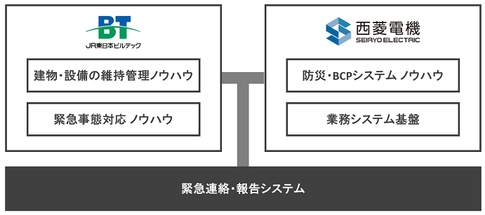 JR東日本ビルテックでは、ファシリティマネジメントの現場において、緊急時でも関係者に必要な情報をタイムリーに共有したいという課題がありました。この課題解決のため、JR東日本ビルテックが持つファシリティマネジメントに関するノウハウの一つである、緊急事態における情報の連絡・共有体制のシステム化による業務の高度化・効率化のアイディアと、西菱電機が得意とする中央省庁・自治体向け防災ソリューションで培われた防災・BCPなどミッションクリティカルな環境に対するシステム開発のノウハウ、そして西菱電機の業務システム基盤を活用し、緊急連絡・報告システムの共同開発に至りました。