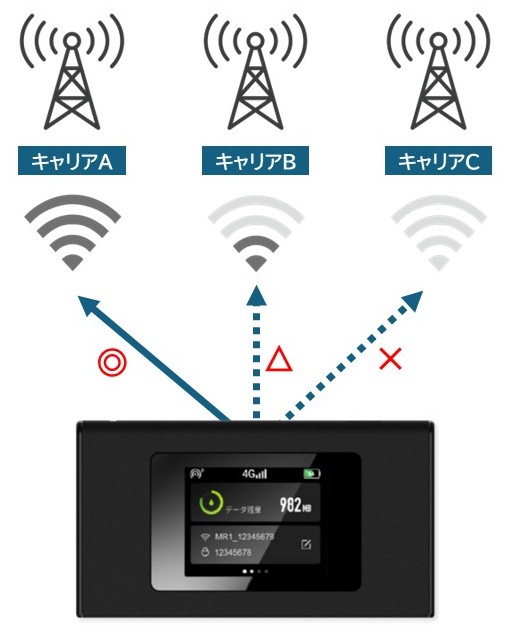 (*)特定の通信キャリアが圏外となった場合、最も安定した回線へ自動切替。通信状況が著しく低下した際は端末操作の「ネットワーク最適化」にて、最も安定した回線を自動で検知し、再接続が可能。