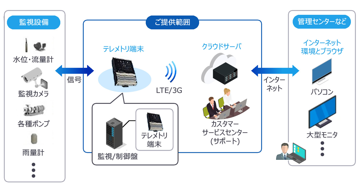 水位や雨量等の気象情報やその他監視・収集情報を携帯電話回線を利用して、当社のクラウドサーバに集約、集約した情報はデータ化・グラフ化し、インターネット等を経由してお客様へ情報提供する遠隔監視システムです。