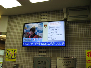 市内のさまざまな場所に設置されたディスプレイを通して、スタジオのライブ映像、伊丹市からのお知らせ、企業コマーシャル、各種インフォメーション、ニュース・天気などの情報をマルチ画面で市民の皆様に提供しています。