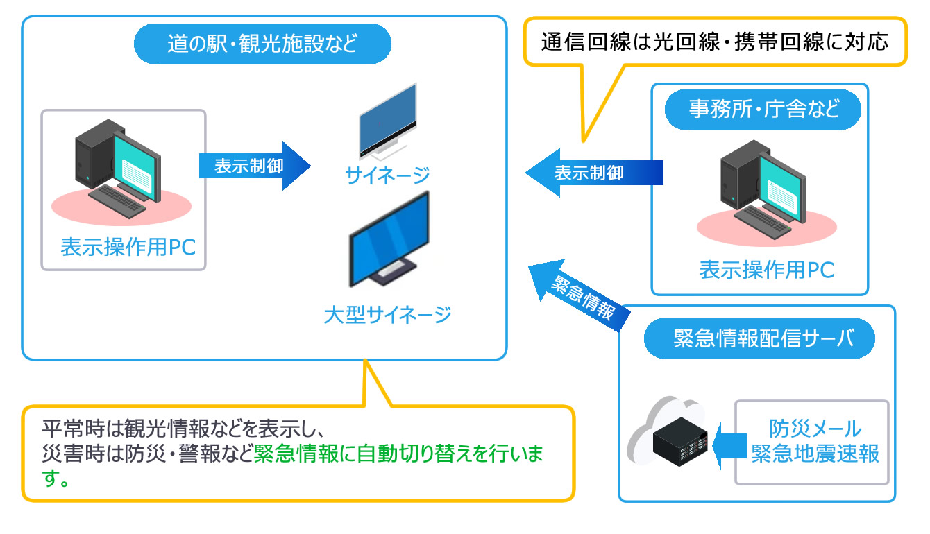 J-ALERTや消防本部の緊急割込み放送などと連動させることができます。防災や地域防犯など緊急情報の配信が可能です。