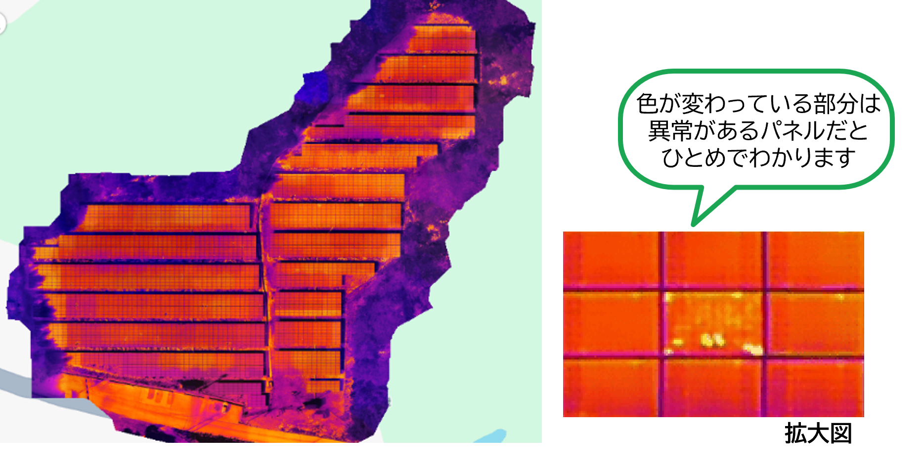太陽光パネルの異常をひと目で特定できるようになるなど、点検業務の効率化と高度化を実現できます。