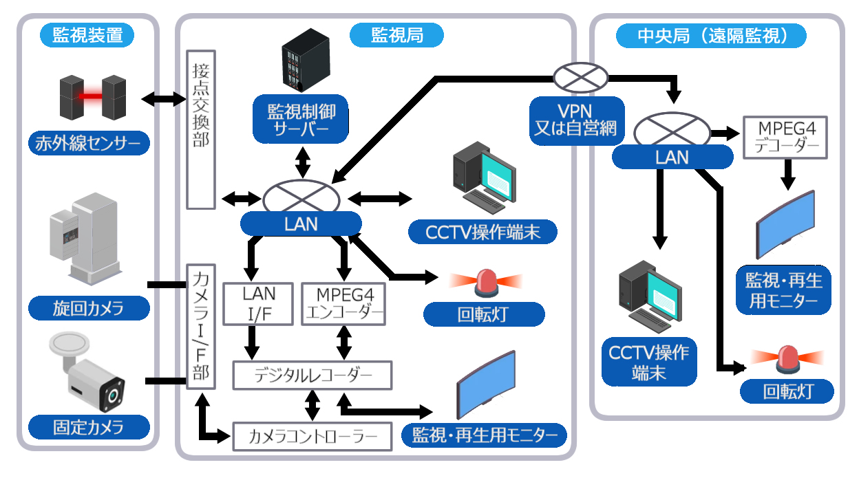 各種センサーとの連動により侵入者を映像監視するとともに、回転灯で警告を行うセキュリティシステムです。