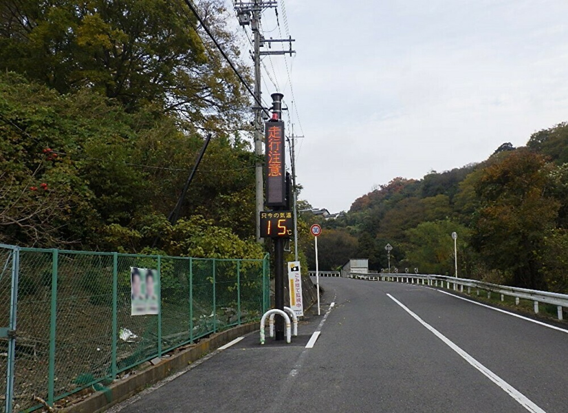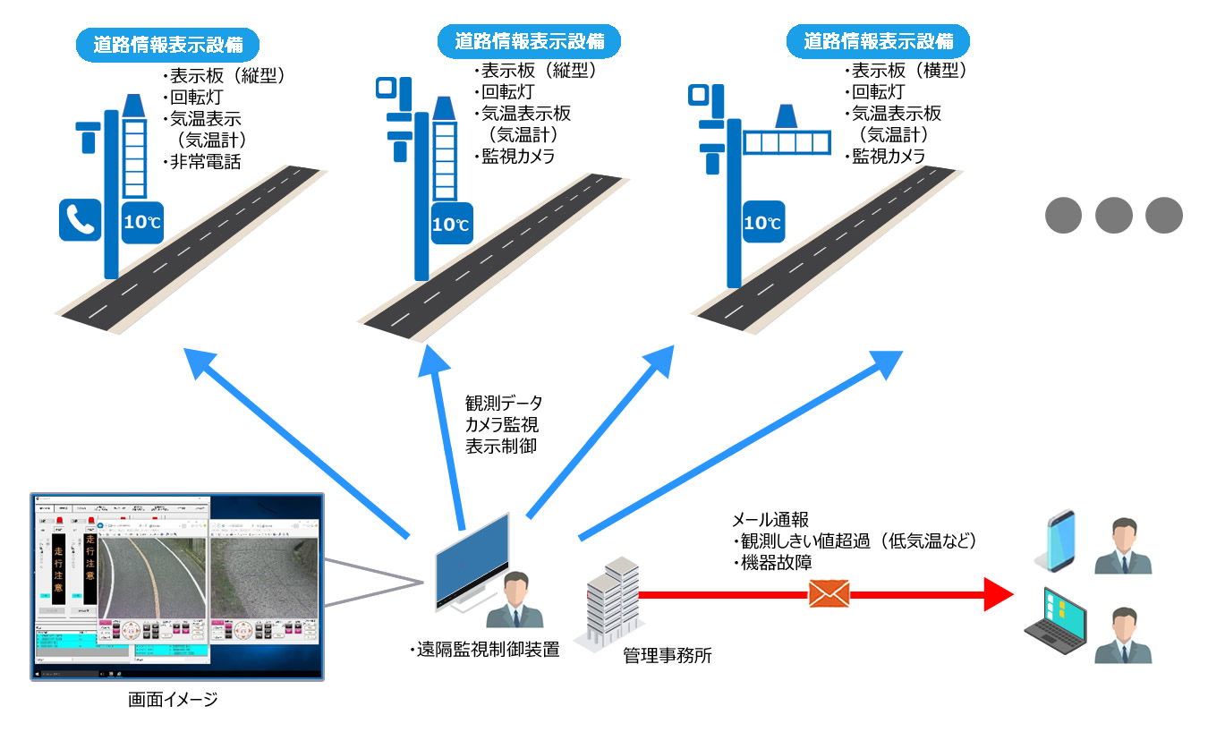 山間部へ続く道路に文字表示板、気温表示板、機側装置、電話収容ボックス、気温センサーから構成される設備を整備。管理事務所からの遠隔操作で、文字のテロップ表示や、現地の気温情報の取得等を行っています。